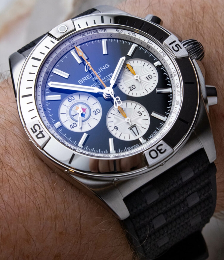 The dials are where each model in the best fake Breitling Chronomat NFL watches develop their own character. We weren’t able to get each of the 32 models in our studio, but both the “Los Angeles Rams” and the “Pittsburgh Steelers” editions we sampled are representative of the series overall. Both models, along with the 30 other available variations, use much of the standard Chronomat layout – the polished baton indices, faceted paddle hands, and the two-sided raised outer chapter ring are all Chronomat hallmarks. In addition, each model in the line opts for recessed, partial azurage semi-matte silver subdials and a matching silver treatment for the outer chapter ring. From here, though, each model diverges, rendering the main dial surface in a given team’s primary color, using the team’s secondary color for the chronograph hands, and adding the team’s logo to the center of the 9 o’clock running seconds subdial.