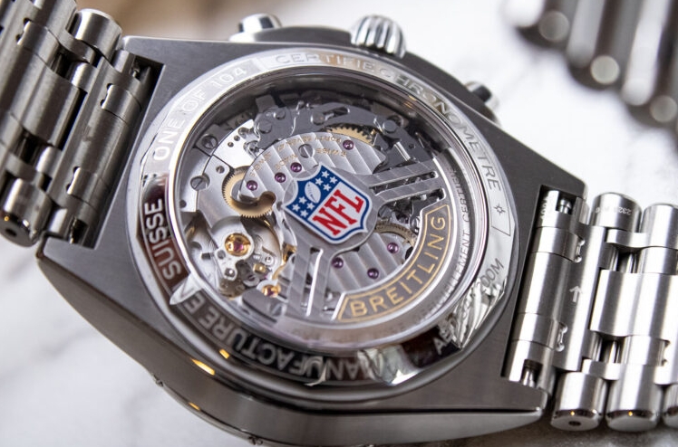 In terms of case design, the models in the AAA replica Breitling Chronomat NFL watches are (wisely) nigh-on identical to their standard Chronomat counterparts. Like their stablemates, then, the Chronomat NFL Collection models wear both wider and thinner than their 42mm wide, 15.1mm thick dimensions suggest. This comes down to a variety of factors, but the two largest contributors to this broad feeling are the extended crown guards and the Chronomat’s signature bezel. On the crown guard front, these prominent, tapering guards flow past the oval chronograph pushers, creating a 3 o’clock case side with considerably more visual bulk than at 9 o’clock. The rotating bezel, though, is a Chronomat mainstay. Both the screws around the bezel edge and the four raised, radially brushed rider tabs work to give the Chronomat its distinctive silhouette, but the mirror-polished bezel insert both inflates the perceived width on the wrist and makes these 1:1 Breitling replica watches a real challenge to photograph. That said, the bold, ultra-reflective look on the wrist certainly gives the Chronomat NFL Collection a premium feel, and it keeps the relatively simple, predominantly brushed main case body from appearing too plain. As for the slimming effect on the overall case thickness, relatively slender case sides and a deep caseback help to hide much of the watch’s bulk between the wrist bones during wear. This caseback is also one of the Chronomat NFL Collection’s statement pieces, with a display window showcasing the lavishly decorated movement beneath a proudly printed NFL shield on the sapphire’s underside. Like the standard Chronomat chronograph, the Chronograph NFL Collection provides a rugged 200 meters of water resistance.